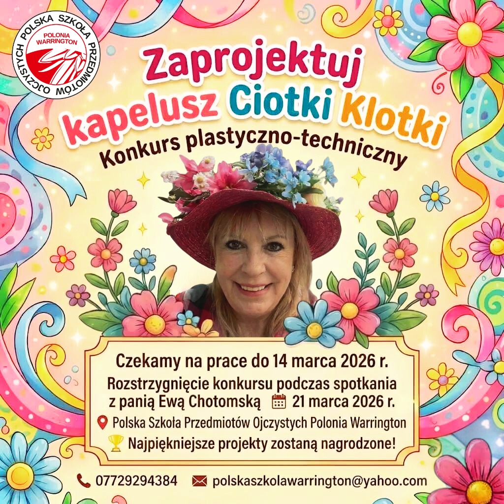 Polska Szkoła Przedmiotów Ojczystych Polonia Warrington serdecznie zaprasza wszystkie dzieci w wieku szkolnym do udziału w konkursie plastyczno‑technicznym „Zaprojektuj kapelusz Ciotki Klotki”.