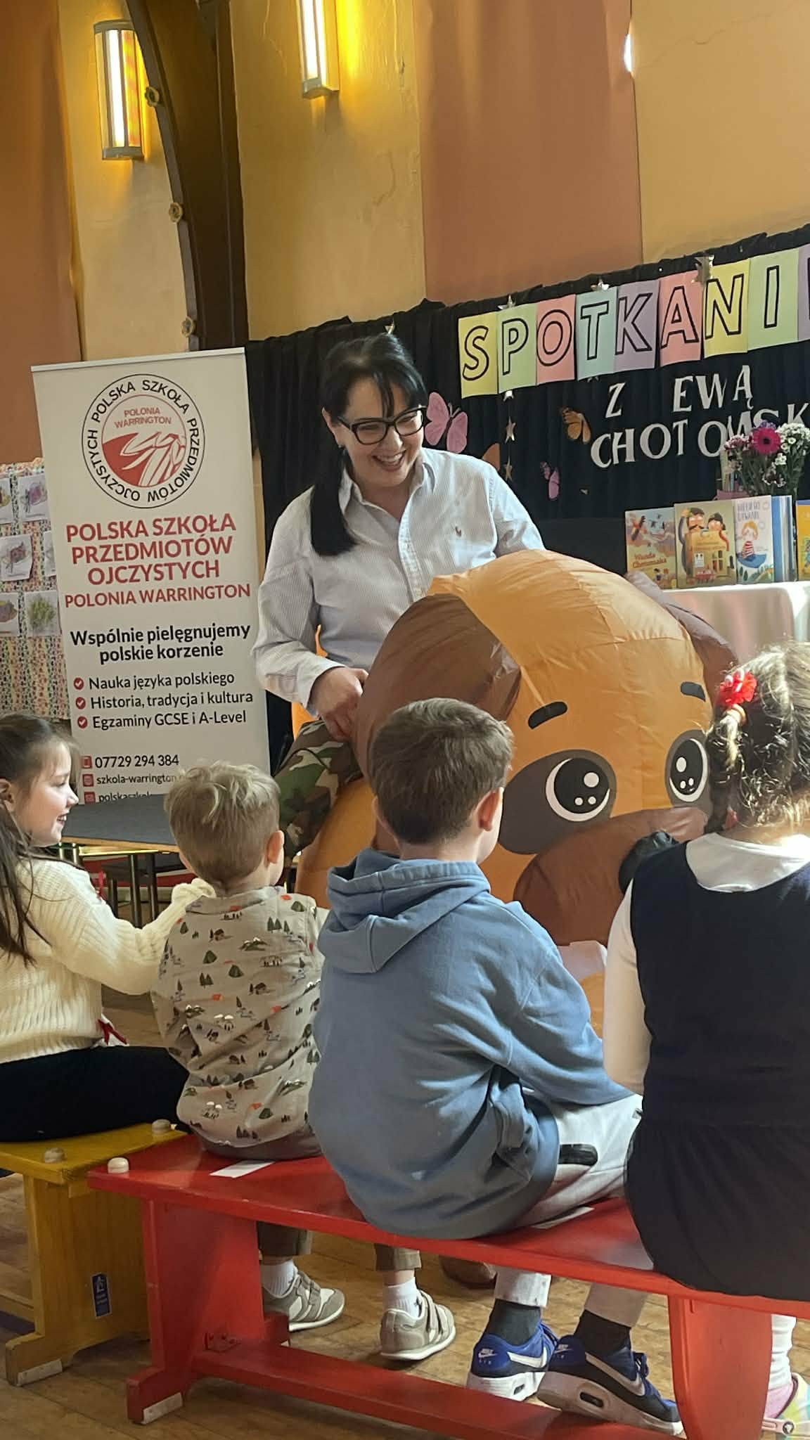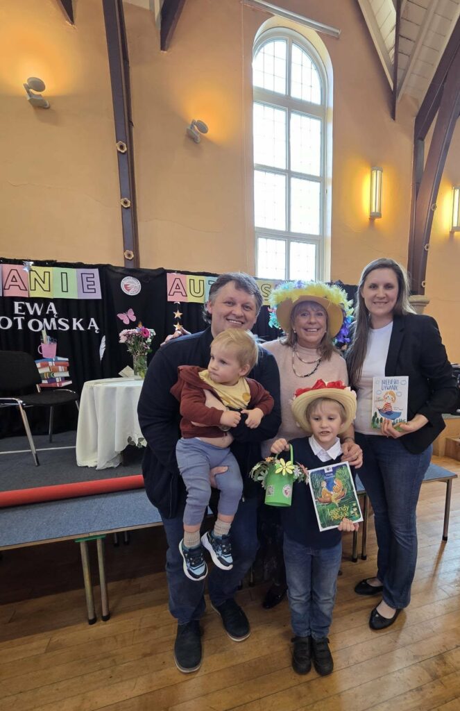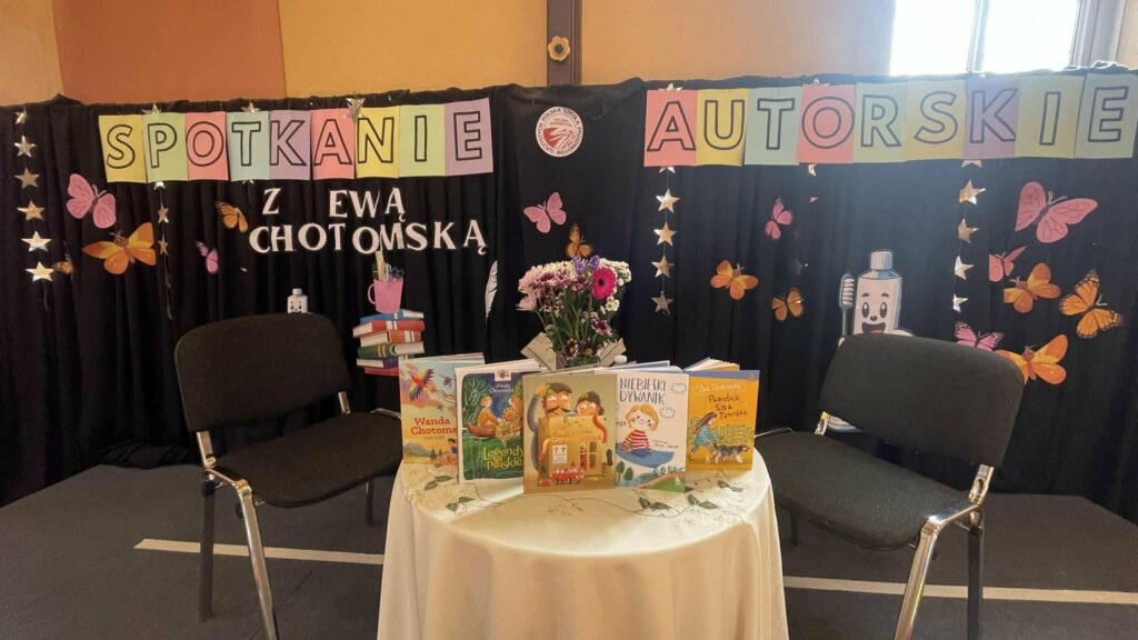Podczas tego wystąpienia wróciliśmy również do początku tej pięknej historii. Opowiedzieliśmy, jak doszło do tego, że pani Ewa Chotomska odwiedziła naszą szkołę. Wszystko zaczęło się od naszego projektu „Piątek z bajką”, dzięki któremu nawiązaliśmy kontakt z panią Ewą, prosząc o zgodę na wykorzystanie utworów jej mamy, Wandy Chotomskiej, w naszych nagraniach.